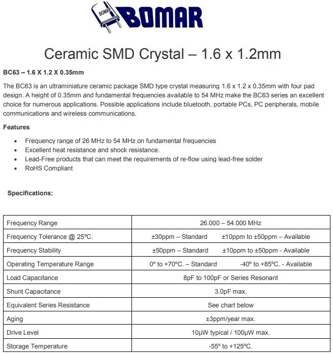 Bomar晶振,BC63晶振,BC63EFD120-30.000000晶振,貼片晶振本身體積小,超薄型石英晶體振蕩器,特別適用于有目前高速發(fā)展的高端電子數(shù)碼產(chǎn)品,因?yàn)榫д癖旧硇⌒突枨蟮氖袌?chǎng)領(lǐng)域,小型,薄型是對(duì)應(yīng)陶瓷振蕩器(偏差大)和普通的石英晶體振蕩器(偏差小)的中間領(lǐng)域的一種性價(jià)比較出色的產(chǎn)品.產(chǎn)品廣泛用于筆記本電腦,無(wú)線電話,衛(wèi)星導(dǎo)航SSD,USB,Blu-ray等用途,符合無(wú)鉛焊接的高溫回流焊曲線特性.Bomar成立于 1963 年,是一家為商業(yè)和雙向無(wú)線電行業(yè)生產(chǎn)石英晶體的制造商。該業(yè)務(wù)的性質(zhì)要求在寬頻率范圍內(nèi)具有嚴(yán)格的容差和高穩(wěn)定性晶體,以滿足嚴(yán)格的 FCC 規(guī)范。快速生產(chǎn)的需求對(duì)我們不斷增長(zhǎng)的客戶群很重要。我們的許多客戶都是當(dāng)?shù)亍⒅莺吐?lián)邦警察和監(jiān)視機(jī)構(gòu)。Bomar 很快不僅成為該市場(chǎng)的領(lǐng)先供應(yīng)商,而且因其產(chǎn)品質(zhì)量、快速周轉(zhuǎn)時(shí)間和無(wú)與倫比的客戶服務(wù)而獲得一致認(rèn)可。