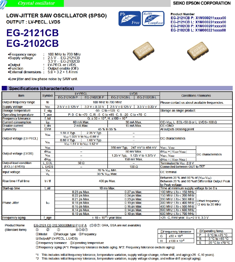 | X1M0002110002 | 愛普生晶振 | EG-2121CB | 212.500000 MHz | 5.00 x 3.20 x 1.40 mm | LV-PECL | 2.375 to 2.625 V | -20 to 70 °C |