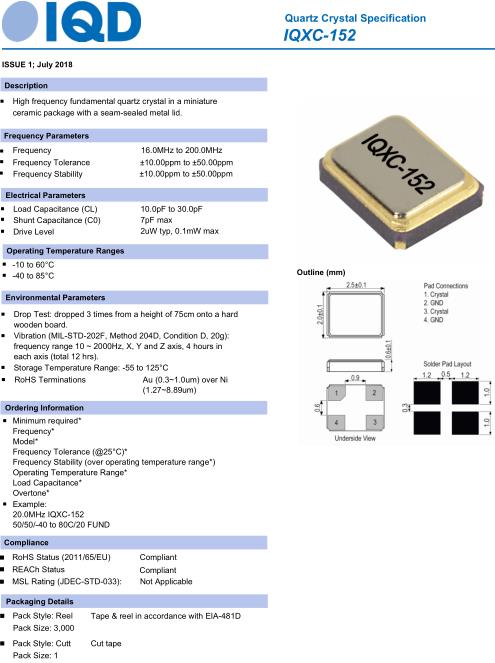 IQD晶振,IQXC-152晶振,20.0MHz-IQXC-152-50/50晶振,小型貼片石英晶振,外觀尺寸具有薄型表面貼片型石英晶體振蕩器,特別適用于有小型化要求的市場領域,比如智能手機,無線藍牙,平板電腦等電子數碼產品.晶振本身超小型,薄型,重量輕,晶體具有優良的耐環境特性,如耐熱性,耐沖擊性,在辦公自動化,家電相關電器領域及Bluetooth,WirelessLAN等短距離無線通信領域可發揮優良的電氣特性,滿足無鉛焊接的回流溫度曲線要求.1979年被收購的雷擴散水晶工廠,主要以生產石英晶體諧振器,有源晶振,石英晶體,貼片晶振,壓控晶體振蕩器為主,產品廣泛用于智能家居,無線通訊,GPS導航,北斗衛星導航等領域.