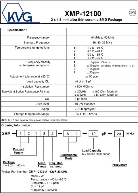 | KVG晶振規(guī)格 | 單位 | XMP-12100晶振頻率范圍 | 石英晶振基本條件 | |